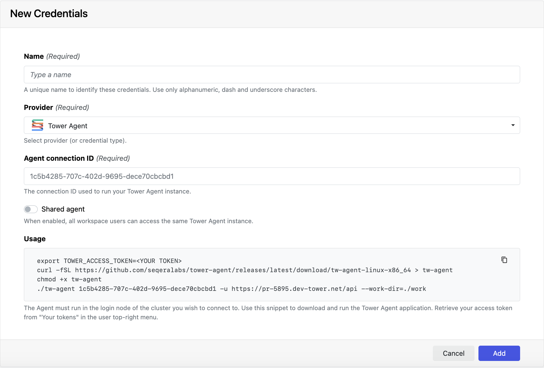 UsagePopulates a code snippet for Tower Agent download with your connection ID. Replace <YOUR TOKEN> with your Seqera access token.